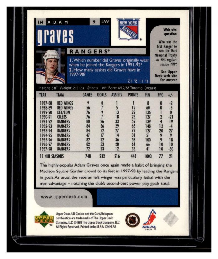 Hockey (Brand: Upper Deck) (Type: UD Choice) (Subtype: ) (Hall of Famer: ) (Superstar: ) (Rookie: ) (Kind of Packaging: Toploader with Sleeve) (Year: 1998) (Unique Number: 134) (Numbered Card: ) (Player: Adam Graves)