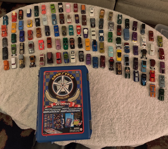 Description: 100 various Hot Wheels vehicles and Johnny Lightening vehicles, in Goodyear Grand Prix Winner Rolling Car Case.