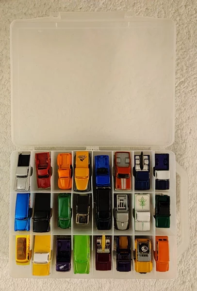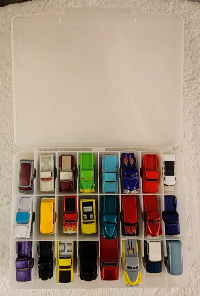 Description: 48 various Hot Wheels and Johnny Lightening vehicles, in double-sided clear 48-compartment Plano case.