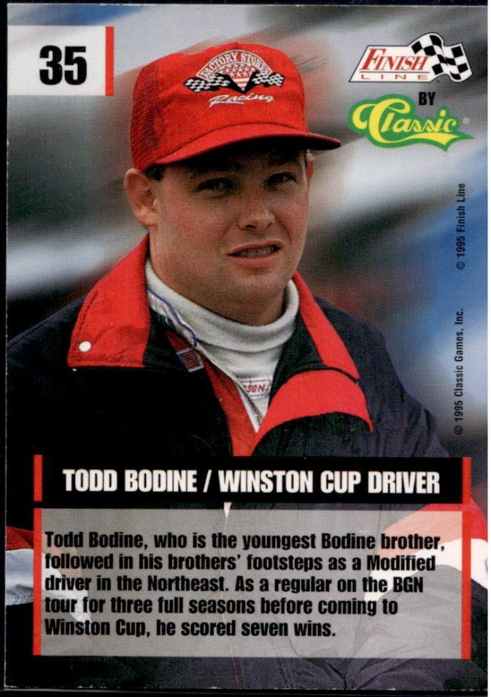 NASCAR (Brand: Classic) (Type: Finish Line) (Subtype: ) (Kind of Packaging: Semi-Rigid with Sleeve) (Year: 1995) (Unique Number: 35) (Numbered Card: ) (Driver: Todd Bodine))