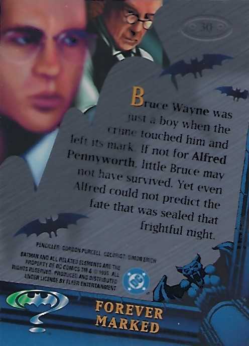 (Brand: DC Comics/Fleer Entertainment) (Type: Batman Metal Forever) (Subtype: ) (Kind of Packaging: Semi-Rigid with Sleeve) (Year: 1995) (Unique Number: 30) (Numbered Card: ) (Feature: Forever Marked)