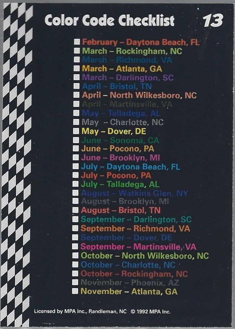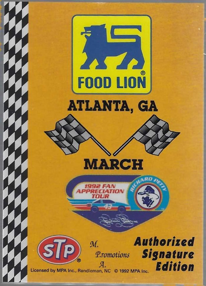 NASCAR (Brand: MPA Inc.) (Type: Food Lion) (Subtype: Atlanta March 1992 Fan Appreciation Tour) (Kind of Packaging: Semi-Rigid with Sleeve) (Year: 1992) (Unique Number: 13) (Numbered Card: ) (Driver: Richard Petty))