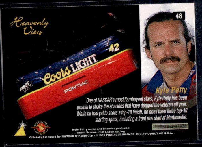 NASCAR (Brand: Pinnacle) (Type: Zenith) (Subtype: Heavenly View) (Kind of Packaging: Semi-Rigid with Sleeve) (Year: 1996) (Unique Number: 48) (Numbered Card: ) (Driver: Kyle Petty))