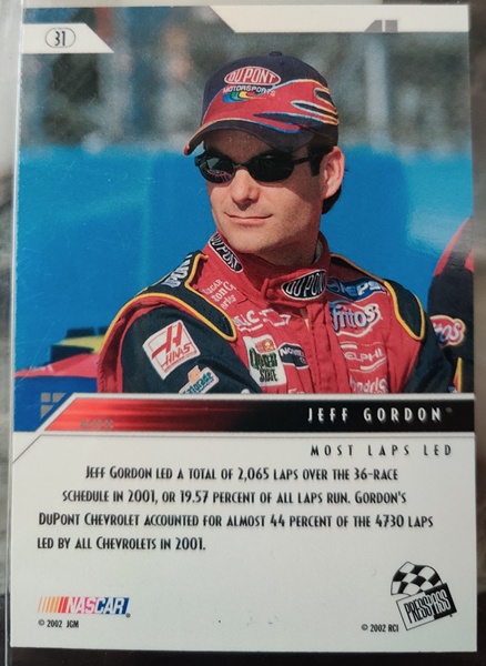 NASCAR (Brand: Press Pass) (Type: Eclipse 2002) (Subtype: 2001 Accolades, Most Laps Led) (Kind of Packaging: Toploader) (Year: 2002) (Unique Number: 31) (Numbered Card: ) (Feature: Jeff Gordon)