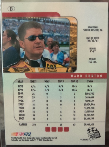 NASCAR (Brand: Press Pass) (Type: Eclipse 2002) (Subtype: NASCAR Winston Cup) (Kind of Packaging: Toploader) (Year: 2002) (Unique Number: 13) (Numbered Card: ) (Feature: Ward Burton)