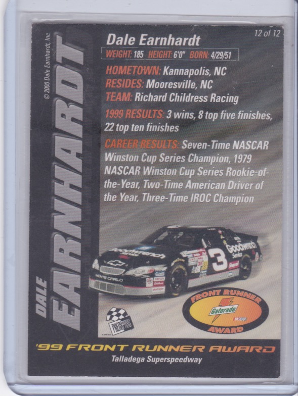 NASCAR (Brand: Press Pass) (Type: Front Runner Award) (Subtype: ’99 Front Runner Winner) (Kind of Packaging: One-Touch) (Year: 2000) (Unique Number: ) (Numbered Card: 12 of 12) (Feature: Dale Earnhardt)