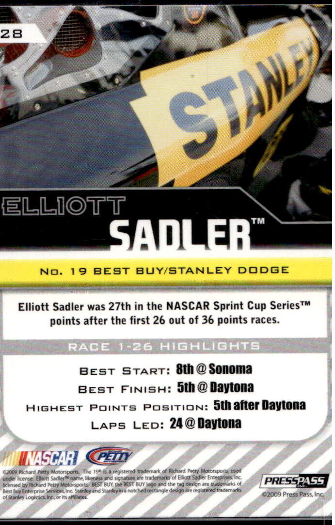NASCAR (Brand: Press Pass) (Type: Press Pass 2010) (Subtype: ) (Kind of Packaging: Semi-Rigid with Sleeve) (Year: 2009) (Unique Number: 28) (Numbered Card: ) (Driver: Elliott Sadler))