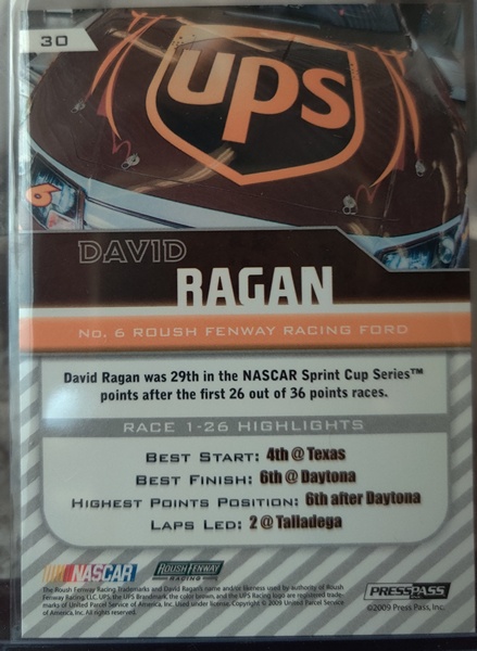 NASCAR (Brand: Press Pass) (Type: Press Pass 2010) (Subtype: ) (Kind of Packaging: Toploader) (Year: 2009) (Unique Number: 30) (Numbered Card: ) (Feature: David Ragan)
