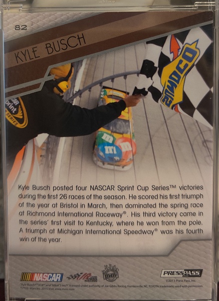 NASCAR (Brand: Press Pass) (Type: Press Pass 2012) (Subtype: Head of the Class) (Kind of Packaging: One-Touch) (Year: 2011) (Unique Number: 82) (Numbered Card: NA) (Feature: Kyle Busch) (Sleeve: No)
