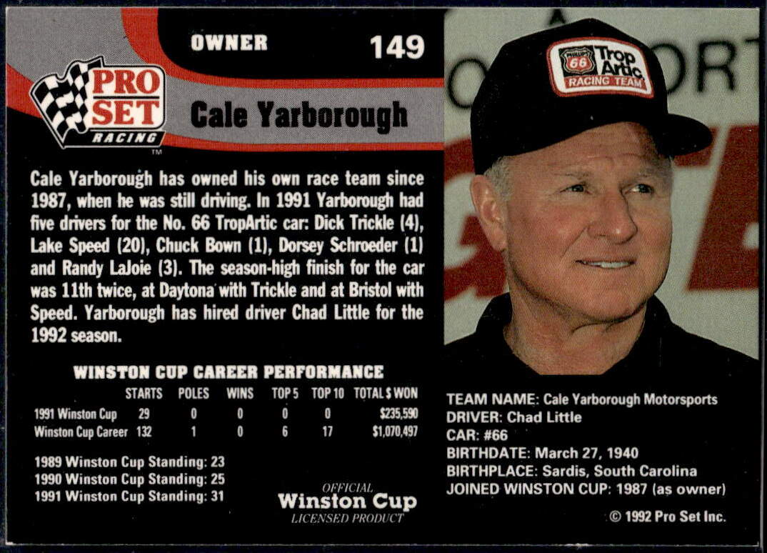 NASCAR (Brand: Pro Set) (Type: Pro Set Racing) (Subtype: Car Owner) (Kind of Packaging: Semi-Rigid with Sleeve) (Year: 1992) (Unique Number: 149) (Numbered Card: ) (Driver: Cale Yarborough))