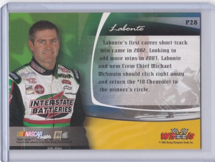 NASCAR (Brand: RCI) (Type: Wheels) (Subtype: ) (Kind of Packaging: One-Touch) (Year: 2002) (Unique Number: P28) (Numbered Card: ) (Feature: Terry Labonte)