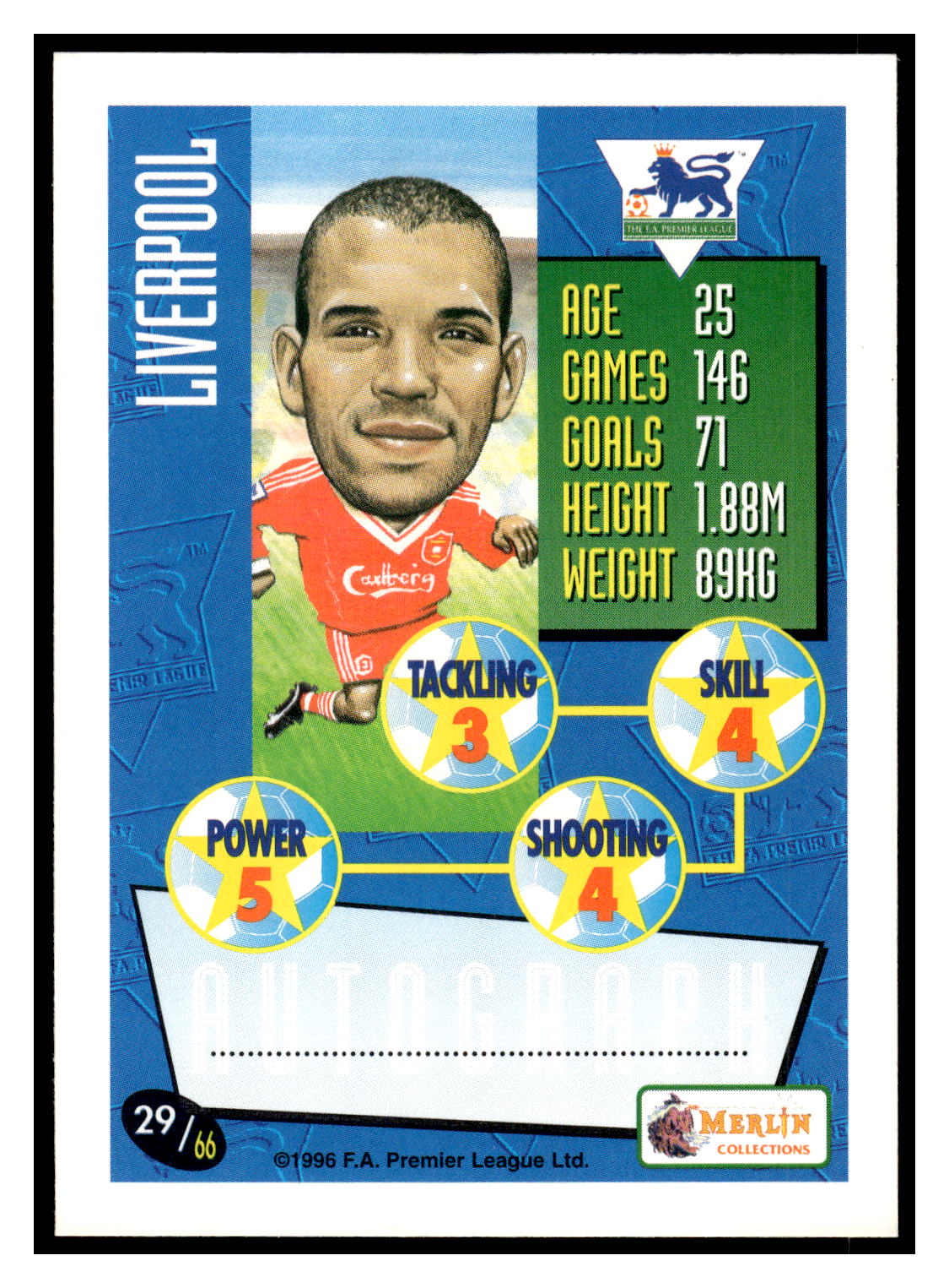 Soccer (Brand: F.A. Premier League Ltd.) (Type: Merlin Collections) (Subtype: ) (Hall of Famer: ) (Superstar: ) (Rookie: ) (Kind of Packaging: Semi-Rigid with Sleeve) (Year: 1996) (Unique Number: ) (Numbered Card: 29/66) (Feature: Stan Collymore)