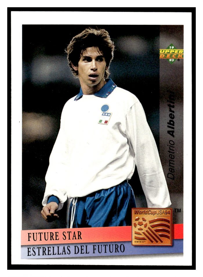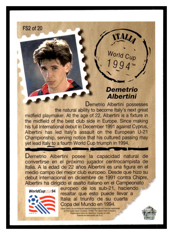 Soccer (Brand: Upper Deck) (Type: Upper Deck 1993) (Subtype: Future Star, WorldCup USA 94) (Hall of Famer: ) (Superstar: ) (Rookie: ) (Kind of Packaging: Semi-Rigid with Sleeve) (Year: 1993) (Unique Number: ) (Numbered Card: FS2 of 20) (Feature: Demetrio Albertini)