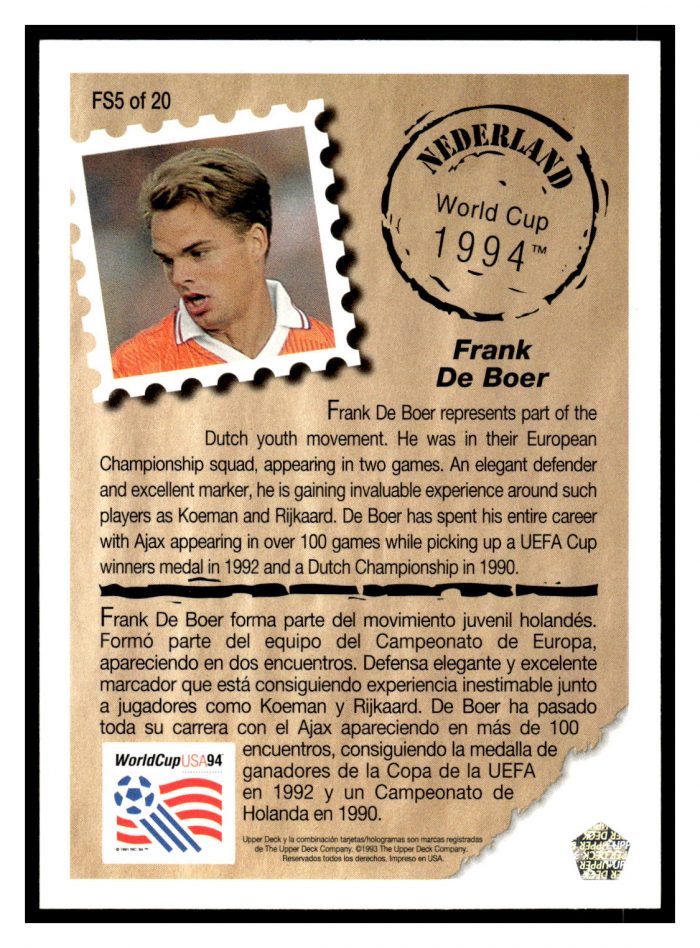 Soccer (Brand: Upper Deck) (Type: Upper Deck 1993) (Subtype: Future Star, WorldCup USA 94) (Hall of Famer: ) (Superstar: ) (Rookie: ) (Kind of Packaging: Semi-Rigid with Sleeve) (Year: 1993) (Unique Number: ) (Numbered Card: FS5 of 20) (Feature: Frank De Boer)