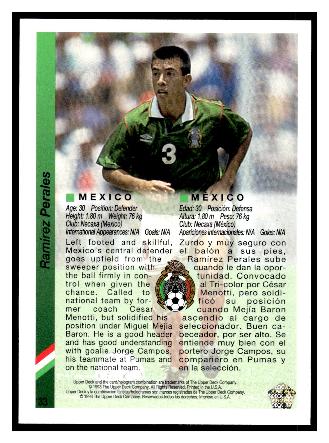 Soccer (Brand: Upper Deck) (Type: Upper Deck 1993) (Subtype: WorldCup USA 94) (Hall of Famer: ) (Superstar: ) (Rookie: ) (Kind of Packaging: Semi-Rigid with Sleeve) (Year: 1993) (Unique Number: 33) (Numbered Card: ) (Feature: Ramirez Perales)