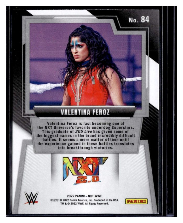 Wrestling (Brand: Panini) (Type: NXT WWE) (Subtype: RC Rookie Card) (Hall of Famer: ) (Superstar: ) (Rookie: Y) (Kind of Packaging: Toploader with Sleeve) (Year: 2022) (Unique Number: 84) (Numbered Card: ) (Feature: Valentina Feroz)